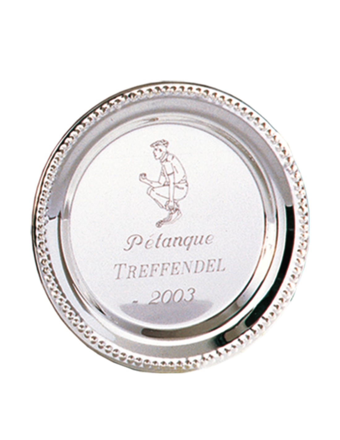 Assiette Métal Personnalisée - Diamètre : 10 cm - Matière de l'assiette : Métal - Finition : métal argenté - Personnalisation : Choisir votre activité - Grand choix de sports et d'activités disponibles - Gravure laser : logo sportif standard et texte - Possibilité d'ajouter votre logo en supplément.