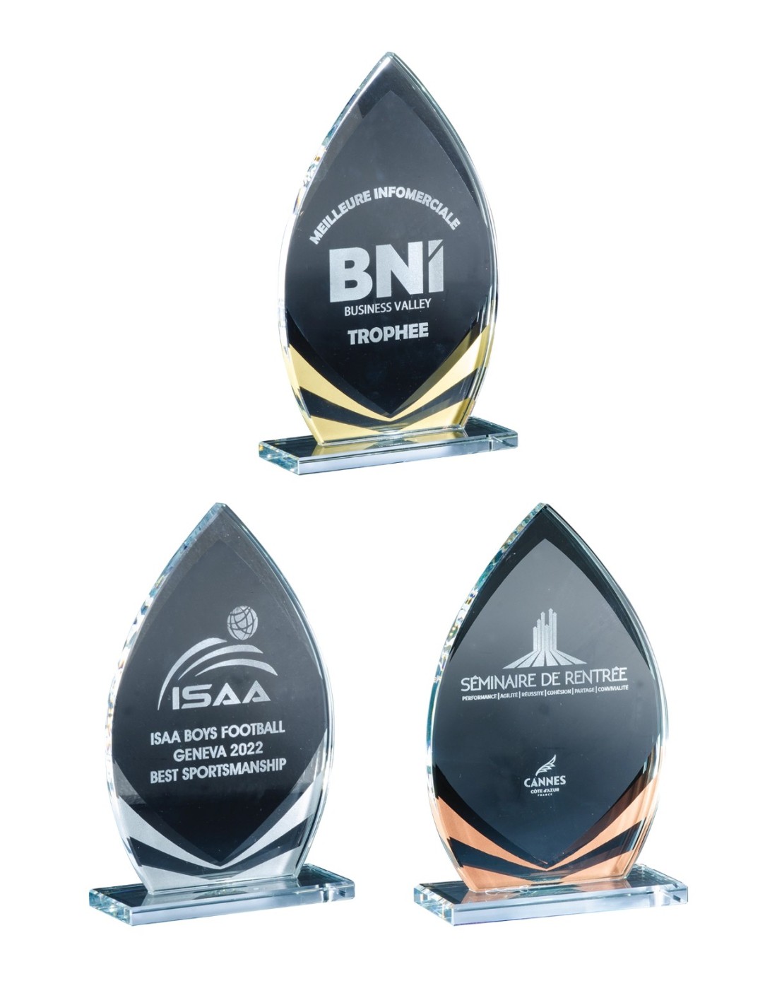 Trophée Verre / Or Personnalisé - Hauteur : 23 cm - Matière du trophée : Verre - Finition : verre transparent - Epaisseur : 10 mm - Personnalisation : Choisir votre activité - Grand choix de sports et d'activités disponibles - Gravure laser : logo sportif standard et texte - Possibilité d'ajouter votre logo en supplément.